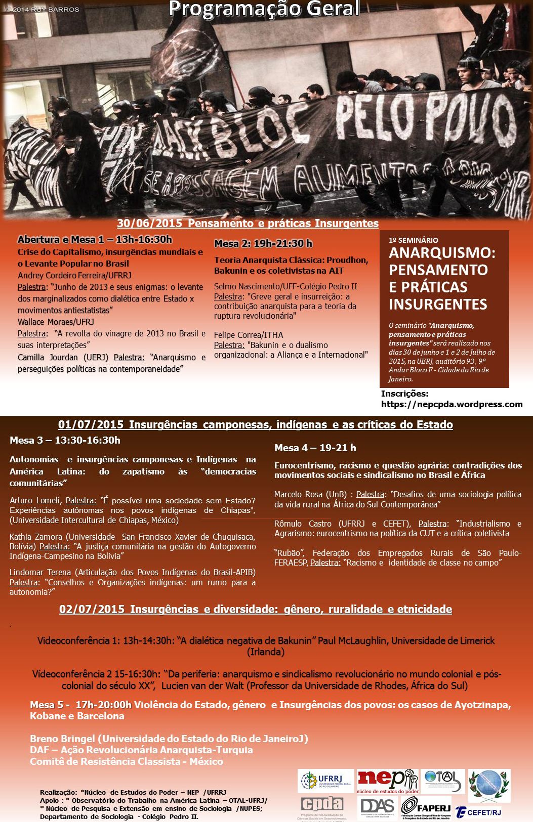 Confira aqui a programação atualizada e definitiva do seminário (mesas e conferências). O Seminário Anarquismo: Pensamento e Práticas Insurgentes será realizado na UERJ-Maracanã, auditório 93, 9o andar. Em breve a programação dos Grupos de Discussão.