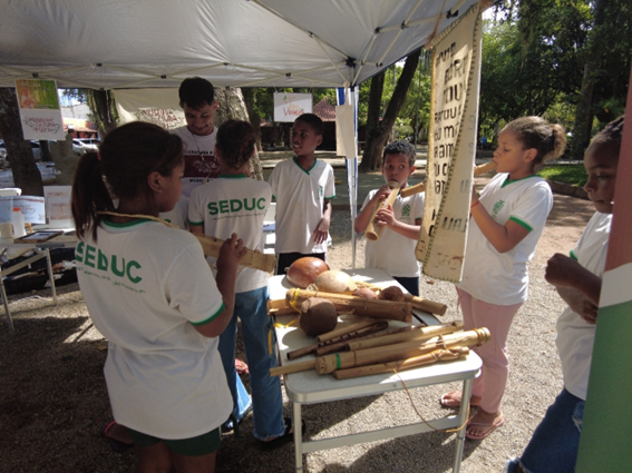 Tenda do Museu da Cultura Puri – Jovens interagindo com instrumentos de bambú